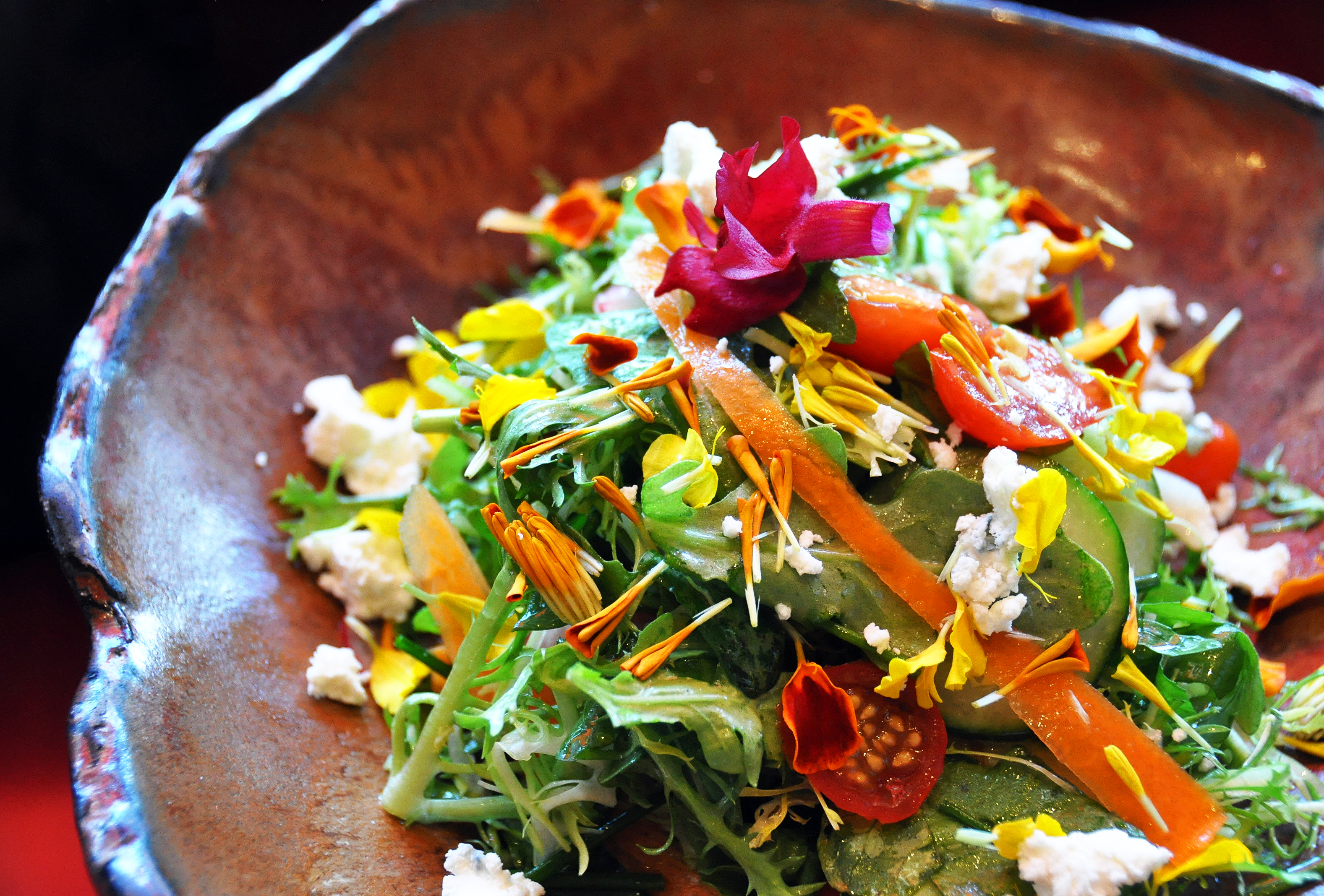 As mentioned before I am not a dessert person but I was still hungry so I ordered a salad instead of dessert as the dressings are sometimes sweet and healthier than a regular sugary ending to a meal. It was such a rich and abundant assortment of flavors: with greens, baby tomatoes, cucumbers, shaved carrots, feta cheese and so many pretty flowers weaved into the mix.