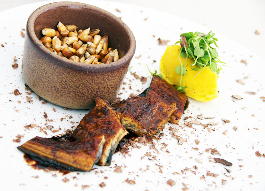 The next dish was quite unique, Unagi Chocolate –served with causa and chocolate sauce. Unagi is the Japanese word for freshwater eel and here it was embellished with a sprinkling of chocolate and a serving of causa. Causa is a Peruvian dish made with papas amarillas, yellow potatoes that resemble Yukon golds. The potatoes were mashed and seasoned with lime juice and aji amarillo. The flavors of the unagi were intense, the strong taste of the unagi contrasting beautifully with the delicate causa that was topped with micro greens. Chocolate, eel and potatoes: a combination made in paradise.
