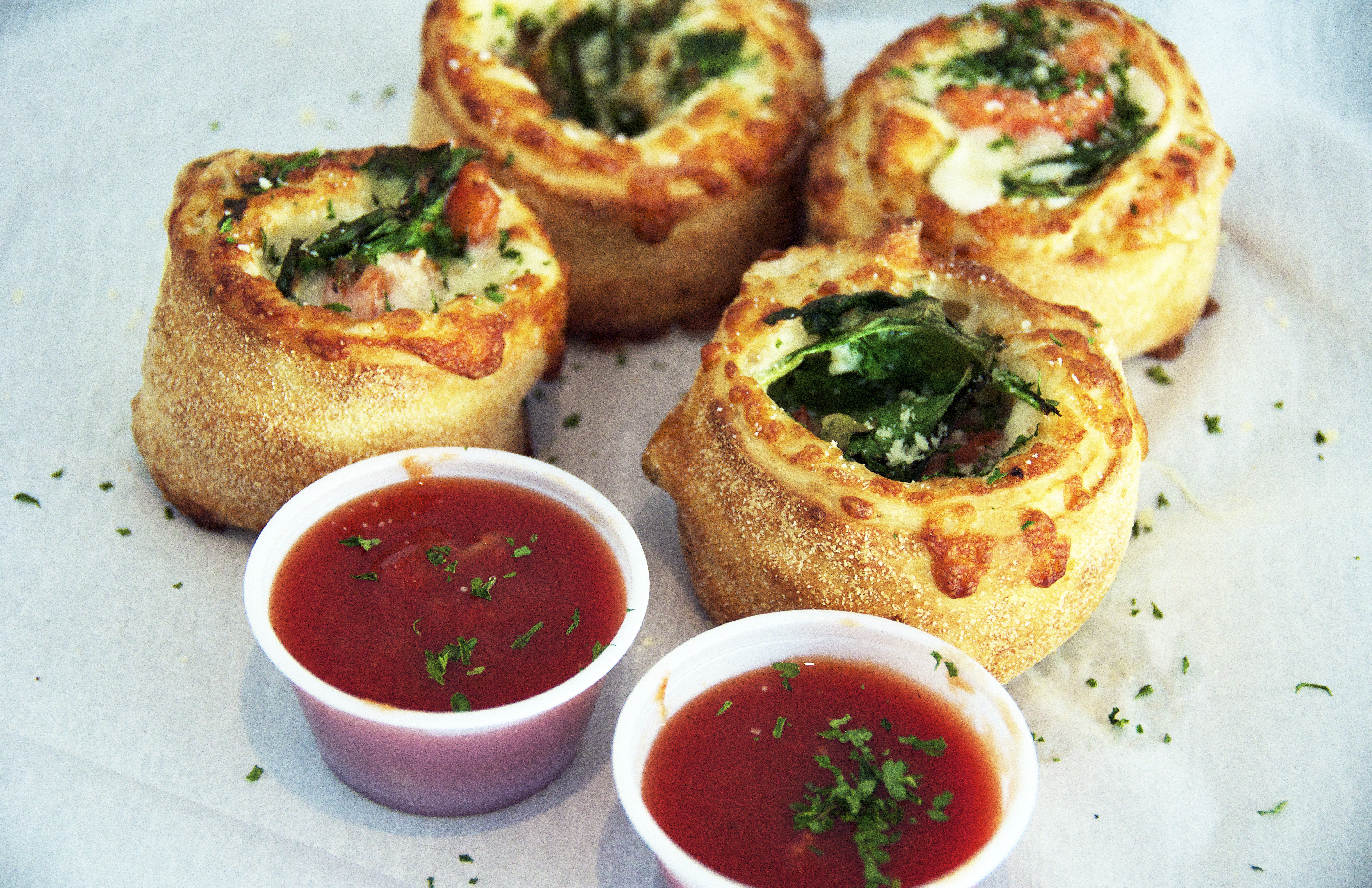 Then came the Power Pinwheels, which were rolled-up dough filled with spinach and tomato. Each order came with five pinwheels and was served with a side of marinara sauce. We really loved these little packages of honest-to-goodness delight. The dough used in this preparation is the same one as the one for the pizzas.