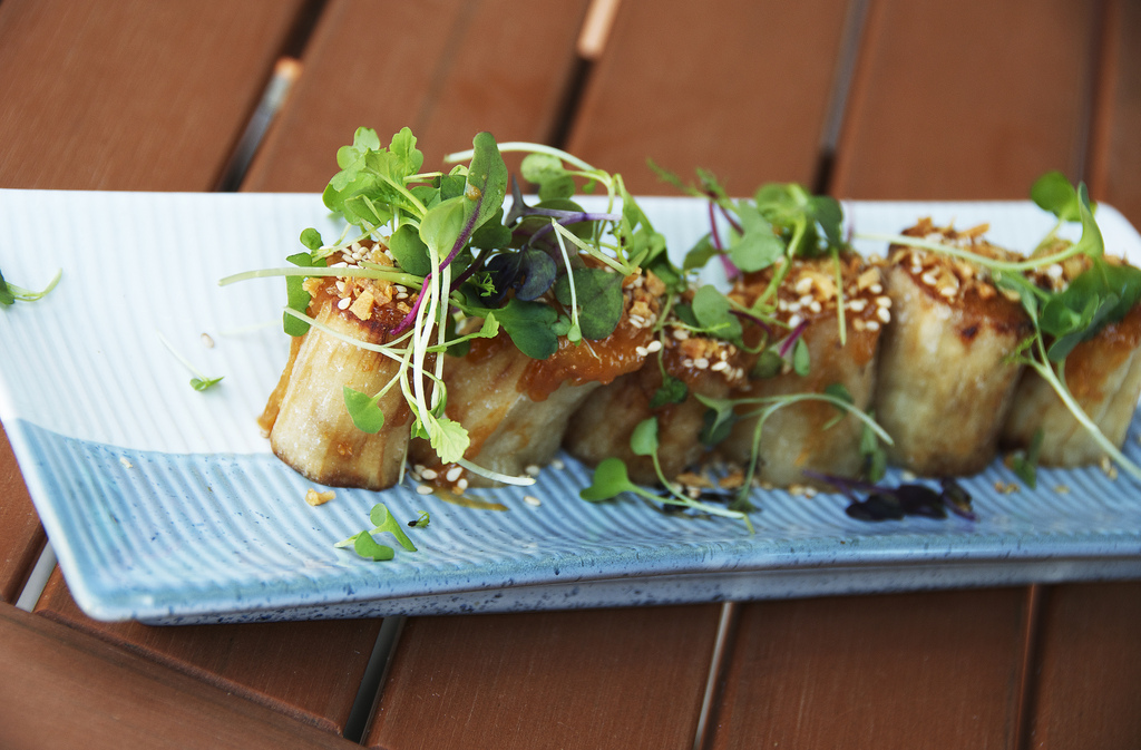 Miss E. and I shared the Yellowtail Hamachi and Eggplant Miso, both very good and very pretty.