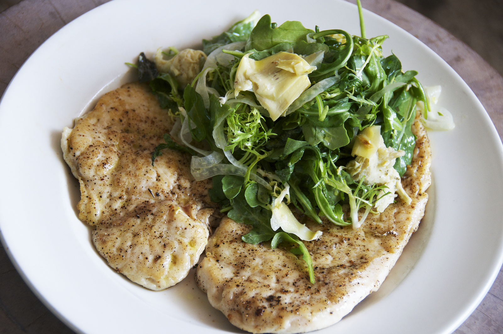 The Chicken Paillard was a flattened chicken breast, sautéed and served as a healthy alternative to a typical burger. It was topped with a salad of baby arugula, shaved fennel, marinated artichokes, and dressed with lemon vinaigrette. It was really delicious in its simplicity; the salad crispy-fresh, a bouquet of greens mixed with artichokes and fennel.