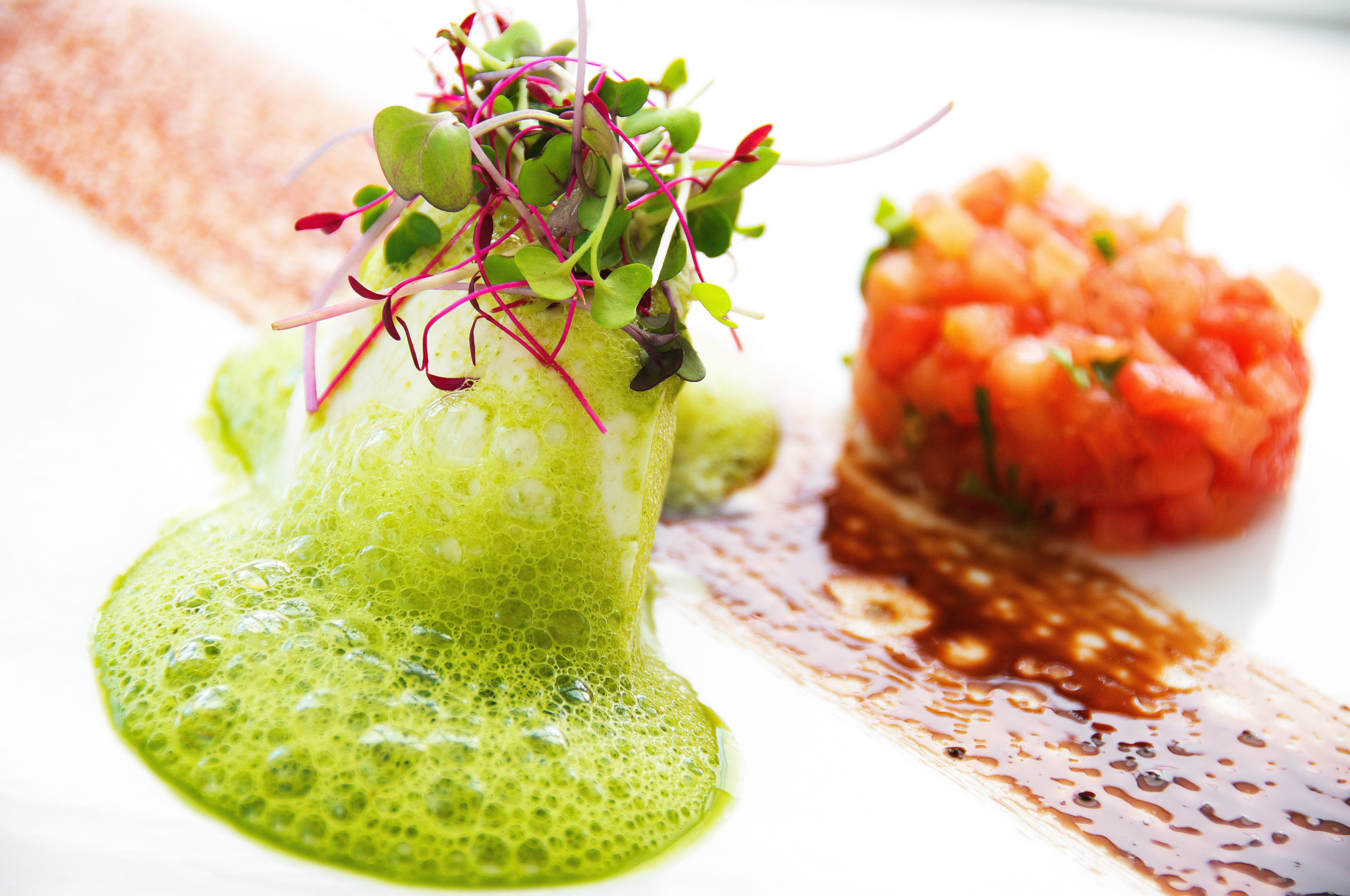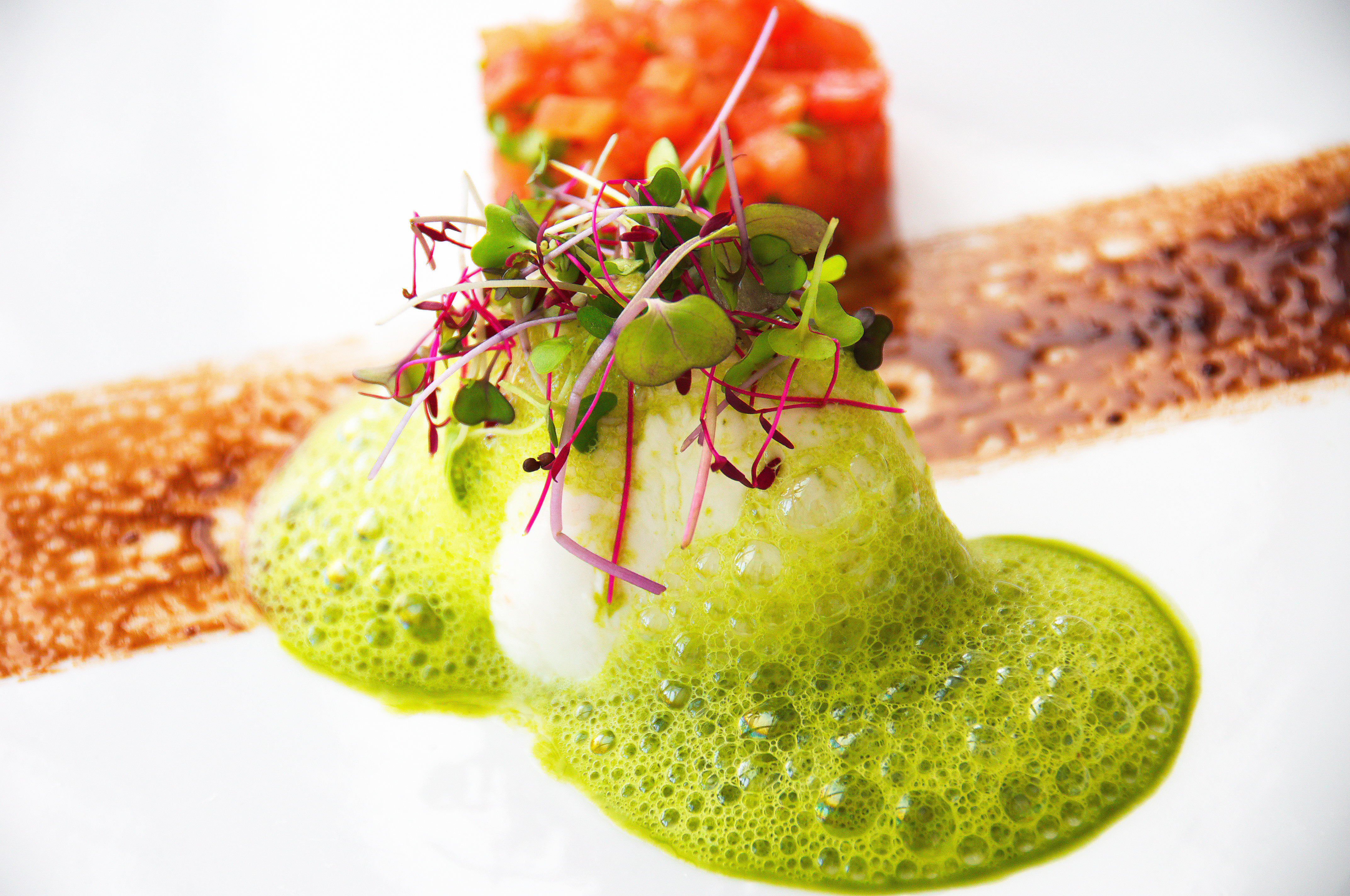 Insalata Caprese – Fresh buffalo mozzarella, basil, tomato tartar served with a mix of sprouts and red balsamic vinegar reduction