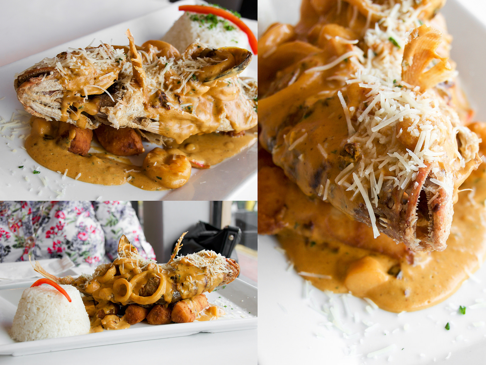 Fried Snapper with Seafood Cream Sauce sprinkled with Parmesan cheese