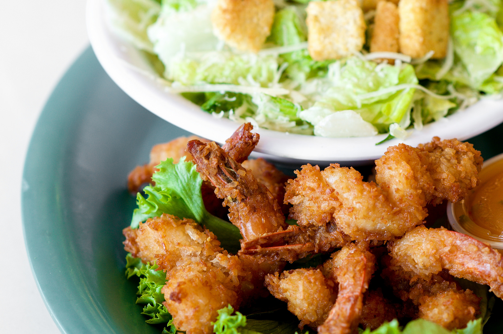 The shrimp were deeply coated with a rather greasy exterior. I was famished, so I ate them all, but I cannot honestly say that I tasted the shrimp. The Caesar Salad that came with it was okay, the croutons being especially delicious.