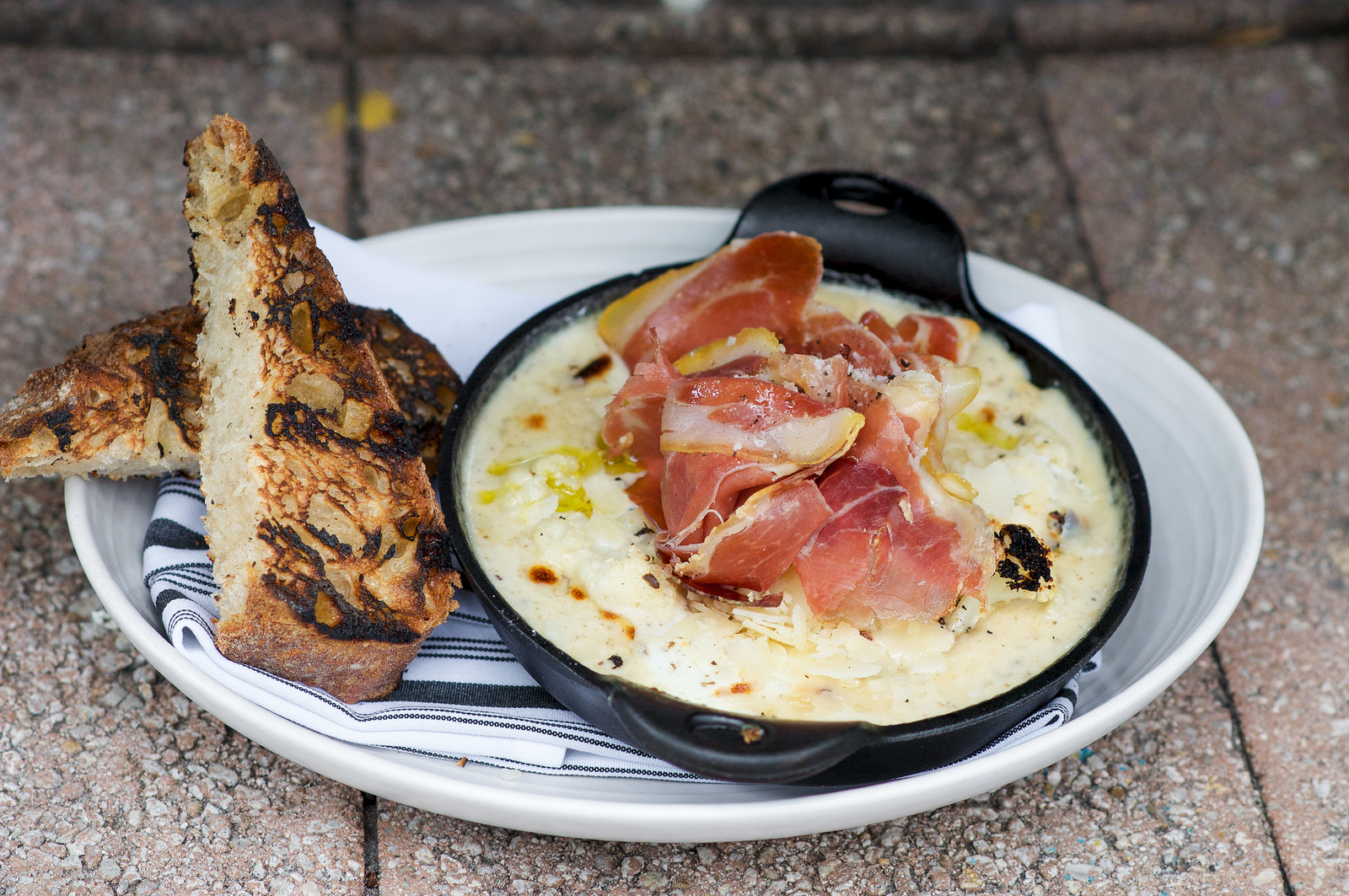 Wood Oven Baked Eggs from Glass and Vine – Confit garlic cream, Grana Padano, cauliflower,cured meat, truffle sauce