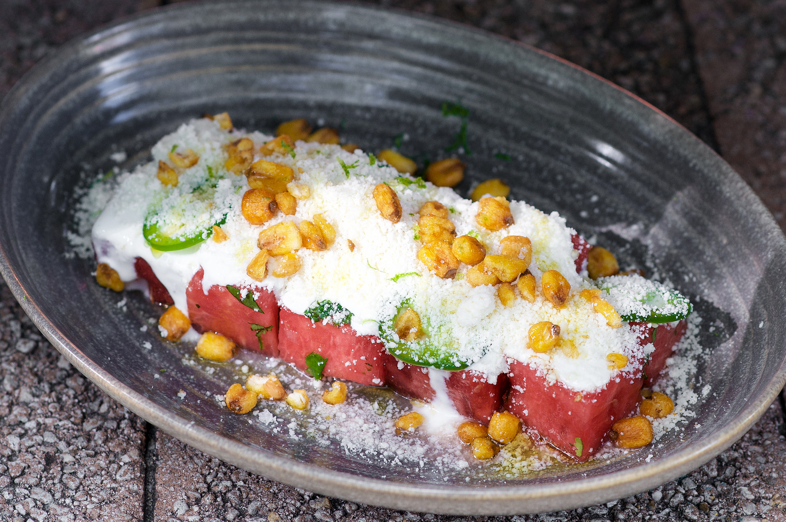We started with a Watermelon Salad – lime crema, cotija, toasted corn, cilantro. This salad was made with a very bizarre combination of ingredients, but somehow this crazy mélange worked. The smell of the cotija cheese was a little bit hard to endure. Cotija cheese is a hard, crumbly Mexican cheese that is made mainly from cow’s milk. It had a strong smell, much like feta, and it was sprinkled all over the dish. One bite was all it took to understand the magical role the watermelon played as a base for this marriage of special components to bloom- the coolness of the watermelon calmed down the intensity of the cheese, and the lime crema brought it all together, the toasted corn added the crunch.