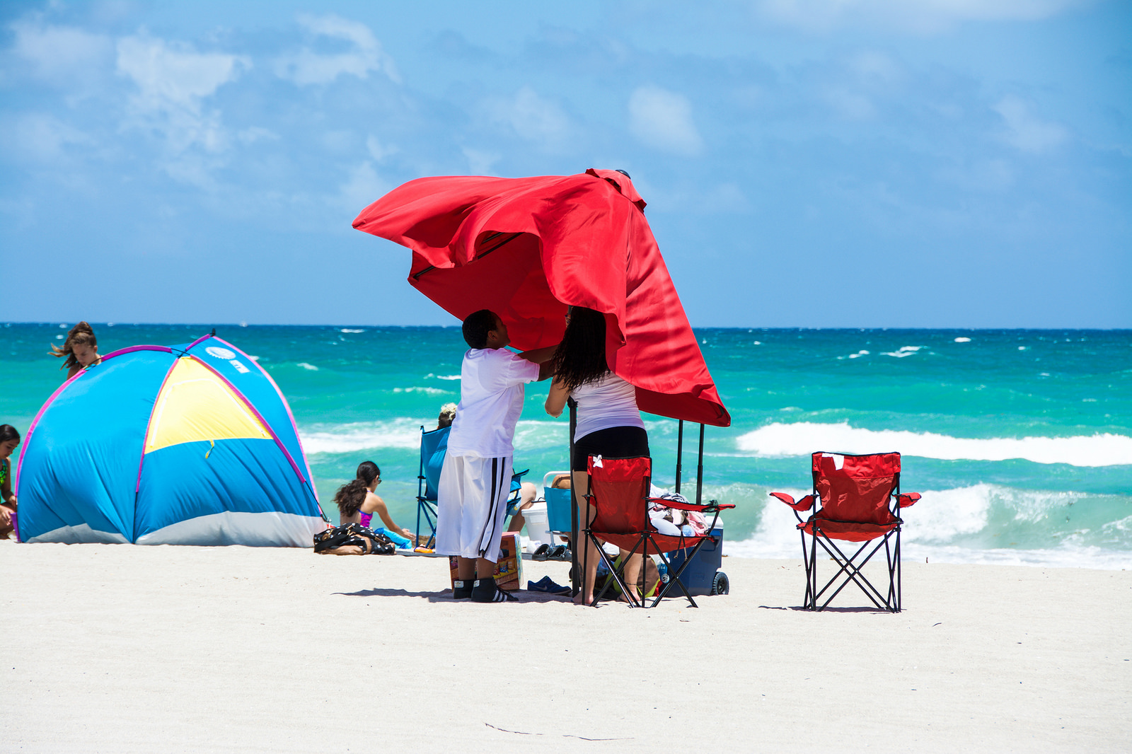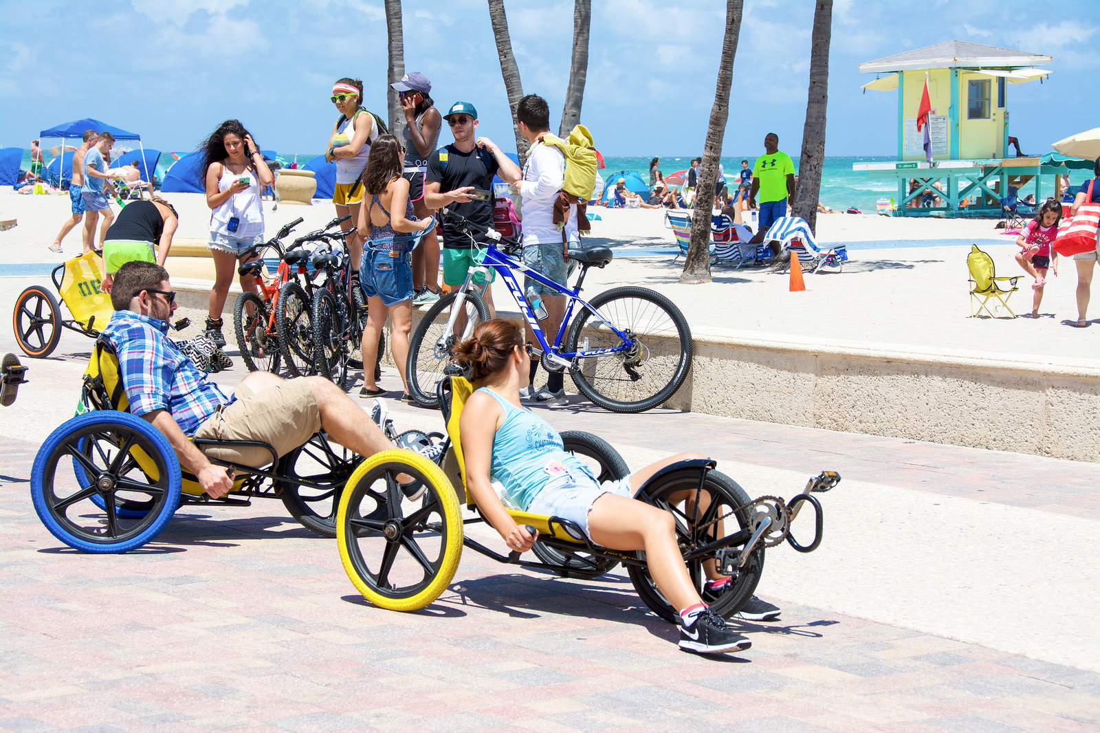 The beach was packed with sunbathers, and people on the broadwalk were jogging, walking, strolling, riding their bicycles and rollerblading.