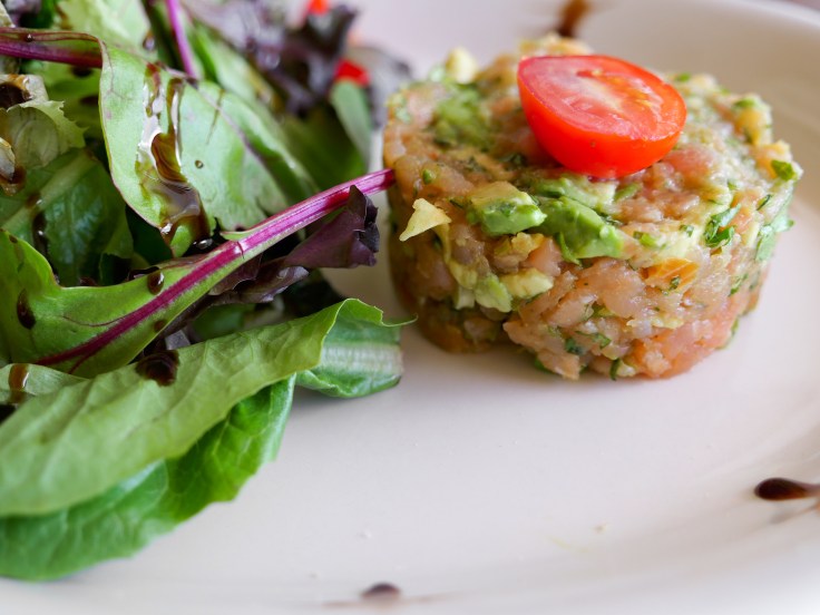 We started out with Smoked Salmon Tartare – diced smoked salmon, avocado, scallions, coriander and citrus dressing. This dish was charming, with lots of personality and character. The avocado added creaminess and depth of flavor. It came with a big salad on the side, with a dash of balsamic vinegar.