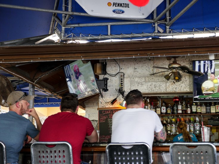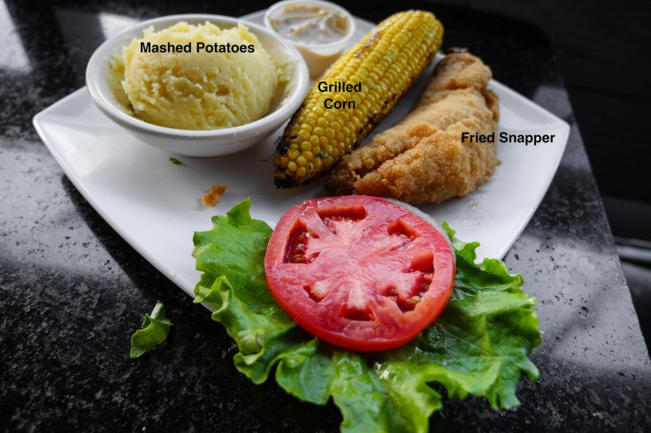It was a beautiful day: blue skies, a gentle breeze, people enjoying the sea. We ordered the Cheeseburger with Fries and Fried Snapped with Mashed Potatoes and Grilled Corn. We were full of food from both dishes so no dessert this time.