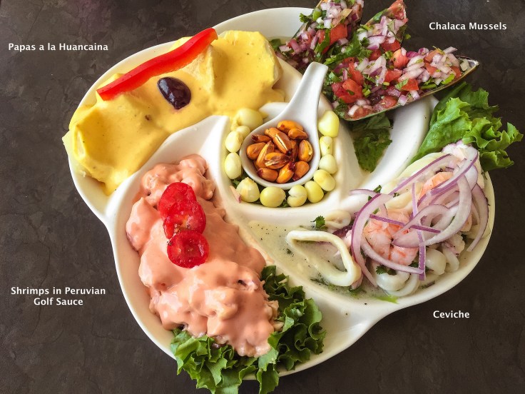 First, the Aromas Appetizer arrived – four spectacular appetizers on one platter. Ceviche, Chalaca Mussels, Papa a la Huancaína, and Shrimp Cocktail.