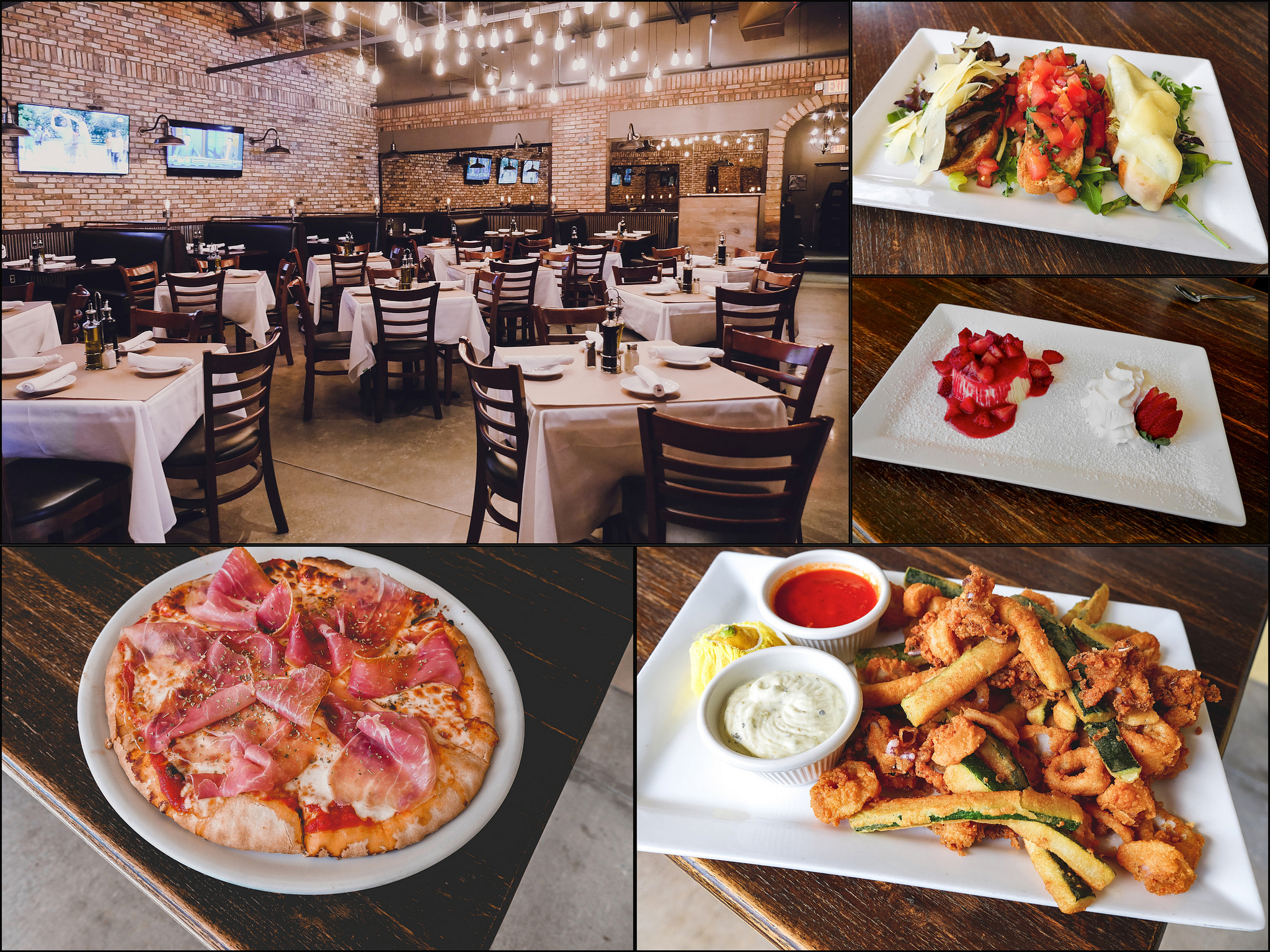 Prosciutto Crudo Pizza, Calamari Fritti, Strawberry Panna Cotta, Bruschette Miste.