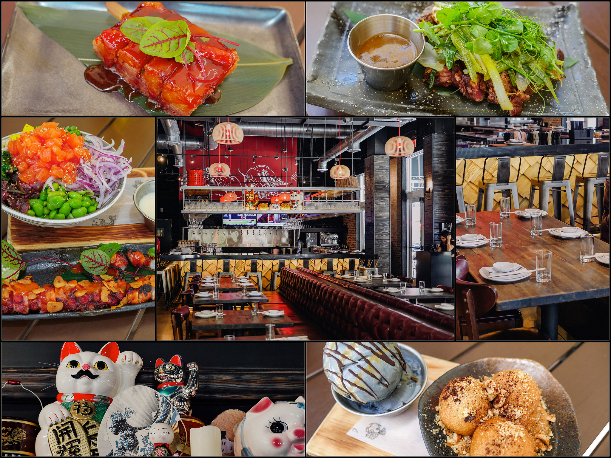 Pork Belly, Filet Mignon, Salmon Poke Bowl, and Grilled Octopus, Sata Andagi, Black Sesame Ice Cream.