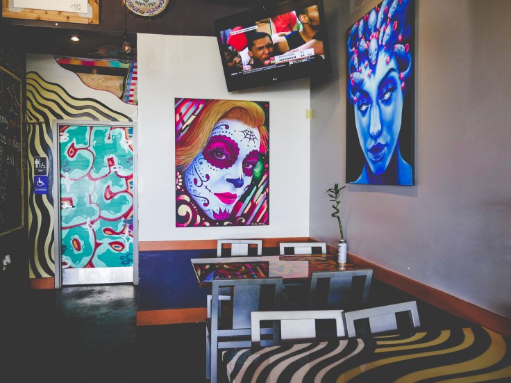 The restaurant was colorful, full of art on the walls and tables – simultaneously modern, funky and cozy. Mister B. was with us, so we had a little feast.