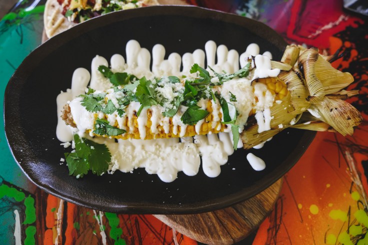 Elote (Grilled Corn – Mexican Style) – Fresh elote with Cajun spices, cotija cheese, crema Mexicana.