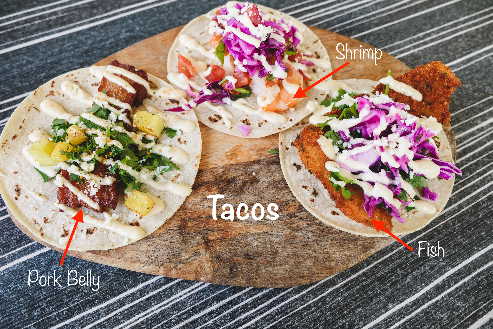 Pork Belly Tacos – Fried pork belly with charred pineapple, garlic aïoli, cilantro, and queso fresco.