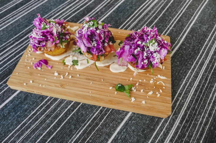 Tostones Rellenos (Shimp) – Pico de gallo, pickled cabbage, garlic aïoli – an exciting combination of flavors.