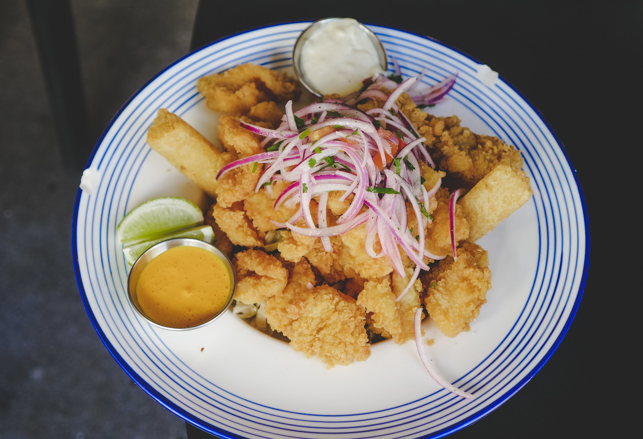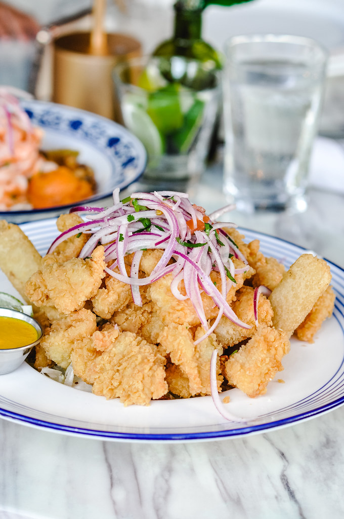 Jalea Real de Pescado – Crispy pieces fried of fish with an unmatched taste, accompanied by golden yuca, tartar sauce, and topped with salsa criolla – Arequipan onions, cilantro, lime, and tomatoes.