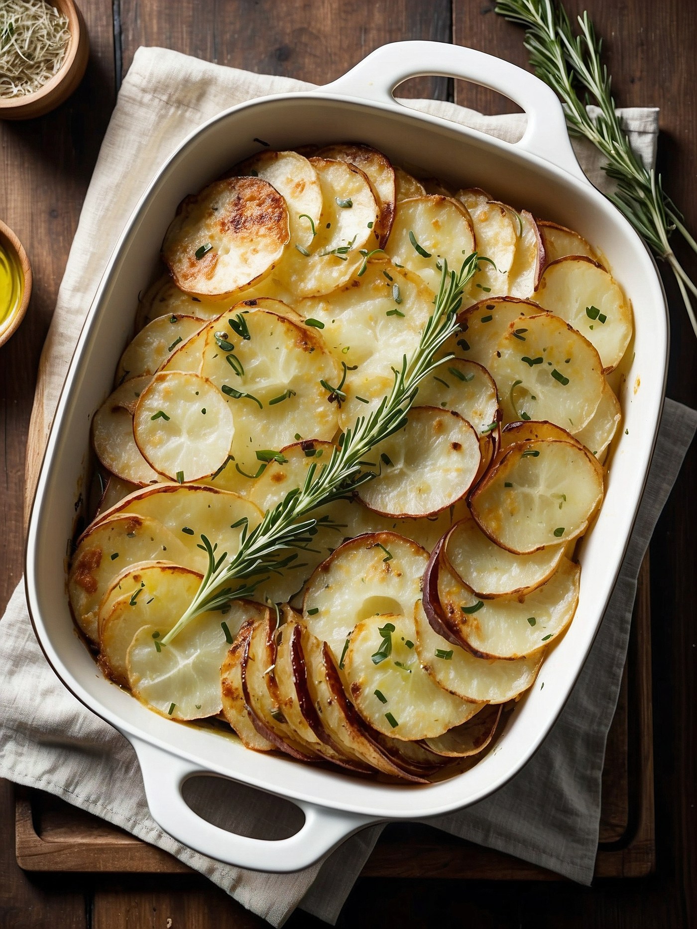 - Layering: In a baking dish, place alternating layers of potato and onion slices. Add salt, pepper, and Parmesan cheese on each layer. Finish with a potato layer.